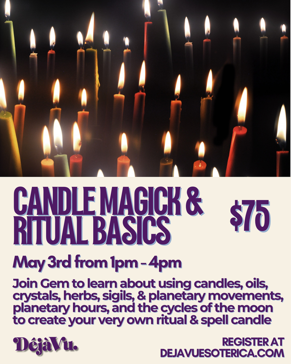 In this class we will learn how to create our own simple candle spells and rituals. While we are together we will discuss spellcraft, making sigils, anointing and dressing candles, altar setup, ritual timing, crystal grids, and you'll create your own completely unique blueprint for a ritual to take home and perform. You'll leave with a handcrafted spell candle as well as information that will help you create your next ritual, too.