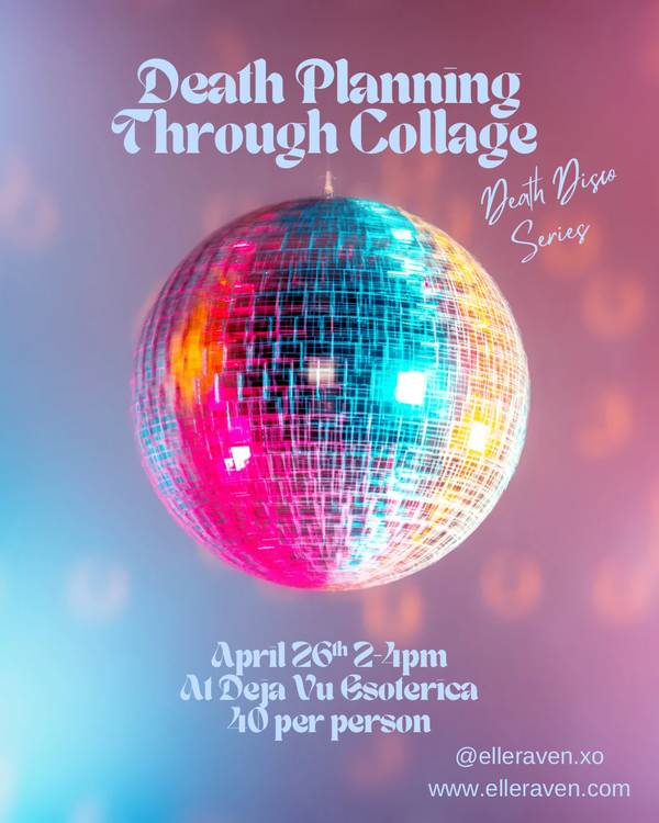 In this month's Death Disco class, we will discuss some of the ways we can plan and prepare for death, and reflect those intentions through collage making. Who said death planning has to be boring or scary? This collage of desires for your end of life can then serve as a memento mori art piece you can continue to reflect on.